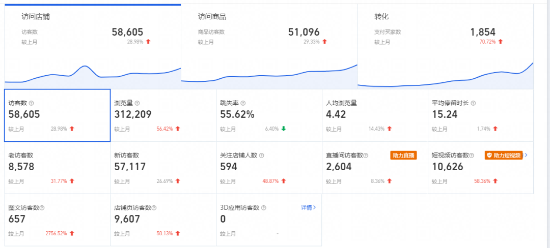 在火蝠電商運營人員光灝(花名)的幫助下,通過制作與產品契合的視頻內容同淘寶光合平臺推廣結合的方式,有效地提高了產品的知名度和吸引力,精準獲客進而促進銷售額增長,單月成交額超30W+,對比增長140%,同時訪客數增長59.23%。