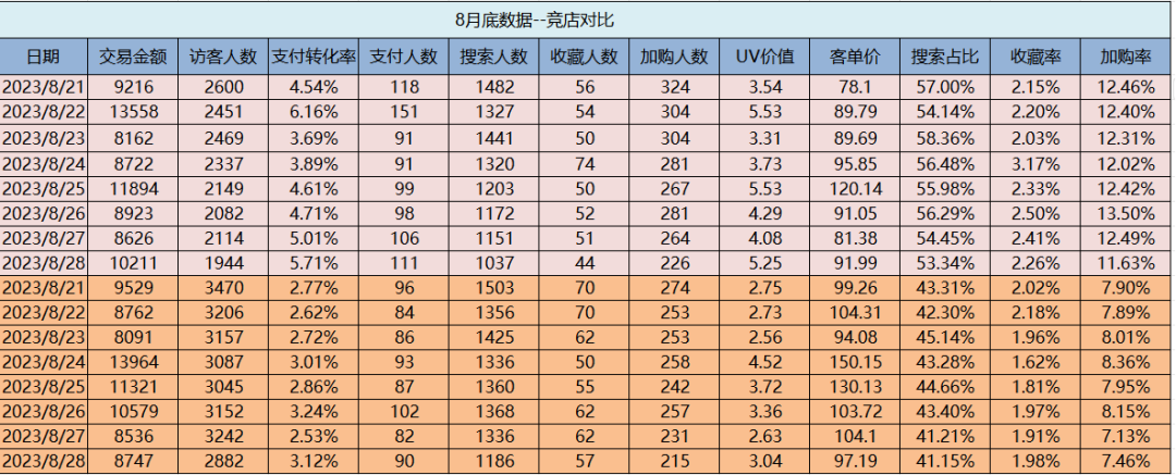 “了解競店的爆款產品,進行數據對比。因為各個店鋪結構的不同,我們會進行對應的改變,使用差異化競爭?!惫鉃嬖V我們,“每周競店數據進行對比,持續感知競店的實時動向,避免運營品牌店鋪被超越。”