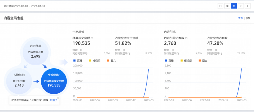 女裝店鋪面對(duì)廣大女性用戶,這一群體對(duì)愛美有著極大的興趣,而抖音直播間(興趣電商)的搭建,恰好為李萌(化名)的女裝店鋪提供了一個(gè)絕佳的流量通道,于是火蝠幫助李萌重新優(yōu)化直播間的裝修風(fēng)格,直播節(jié)奏,以及內(nèi)容話術(shù)來吸引消費(fèi)人群,助力女裝店鋪完成沖刺目標(biāo)從而實(shí)現(xiàn)彎道超車,最終在直播賽道取得矚目成績(jī),內(nèi)容種草2695人,累計(jì)粉絲數(shù)2413,直播成交19萬。